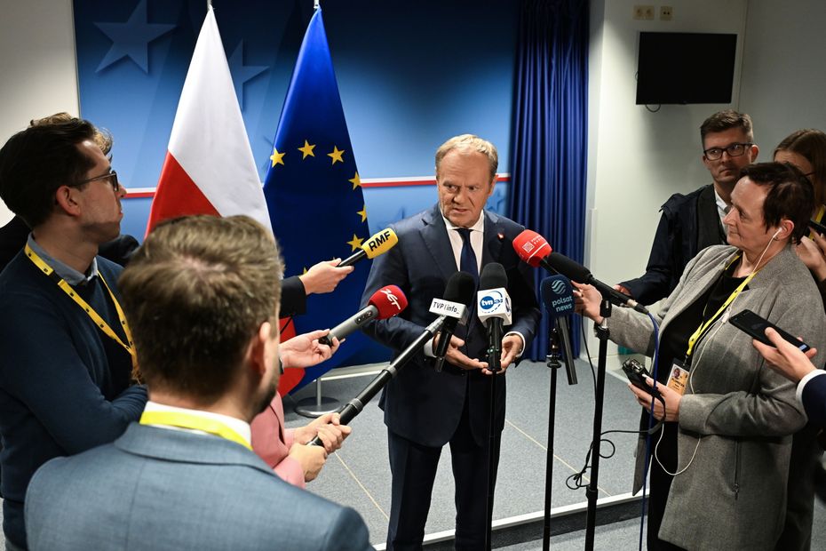 Na zdjęciu: konferencja prasowa w Brukseli, premiera RP Donalda Tuska (C) po zakończeniu posiedzenia Rady Europejskiej. Szczyt w Brukseli poświęcony był m.in. wsparciu Ukrainy i zwiększeniu gotowości obronnej Europy. (amb) PAP/Wiktor Dąbkowski