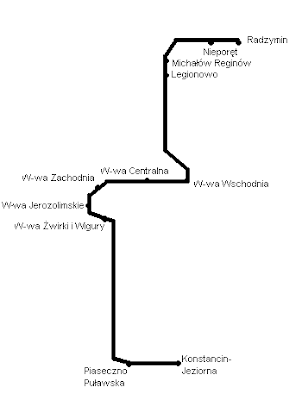 Proponuję wprowadzenie w relacji Konstancin Jeziorna- Warszawa Centralna- Legionowo- Radzymin linii ekspresu regionalnego obsługiwanej zespołami trakcyjnymi o napędzie spalinowym, tzw. autobusami szynowymi. Linia pomijałaby większość przystanków osobowych na trasie, jej priorytetem byłby przede wszystkim szybki czas przejazdu. Linia kursowałaby początkowo z częstotliwością co 30 minut, zaś częstotliwość docelowa wynosiłaby 20 minut. Czas dojazdu do centrum Warszawy musiałby wynosić maksimum 30- 40 minut, i takie czasy przejazdu są do osiągnięcia dzięki przyspieszeniu na częściowo zmodernizowanych odcinkach linii.