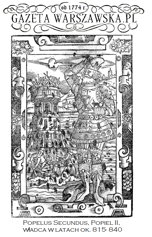 Za namową Niemki żony swojej udał on chorobę i jakoby umierając sprosił stryjów swojich których częstując wszystkich razem wytruł Z ciał tych potrutych stryjów w jezioro Gopło powrzucanych wyszła wielka moc szczurów i myszy która ruszyła prosto na zamek książęcy w Kruszwicy. Na ten widok wszyscy dworzanie uciekli. Uciekał i książe Popiel ale go myszy goniły Uciekał w pole myszy za nim na łódź na jezioro dalejże i myszy płynęły za nim Popiel na wyspę iw wieży na wyspie stojącej z żoną i synami schronienia szukał myszy tiż za nim Opadłszy naostatek w tej wieży Popiela z żoną i dwoma synami zagryzły i zjadły. Takim przypadkiem zginął dom panujących.