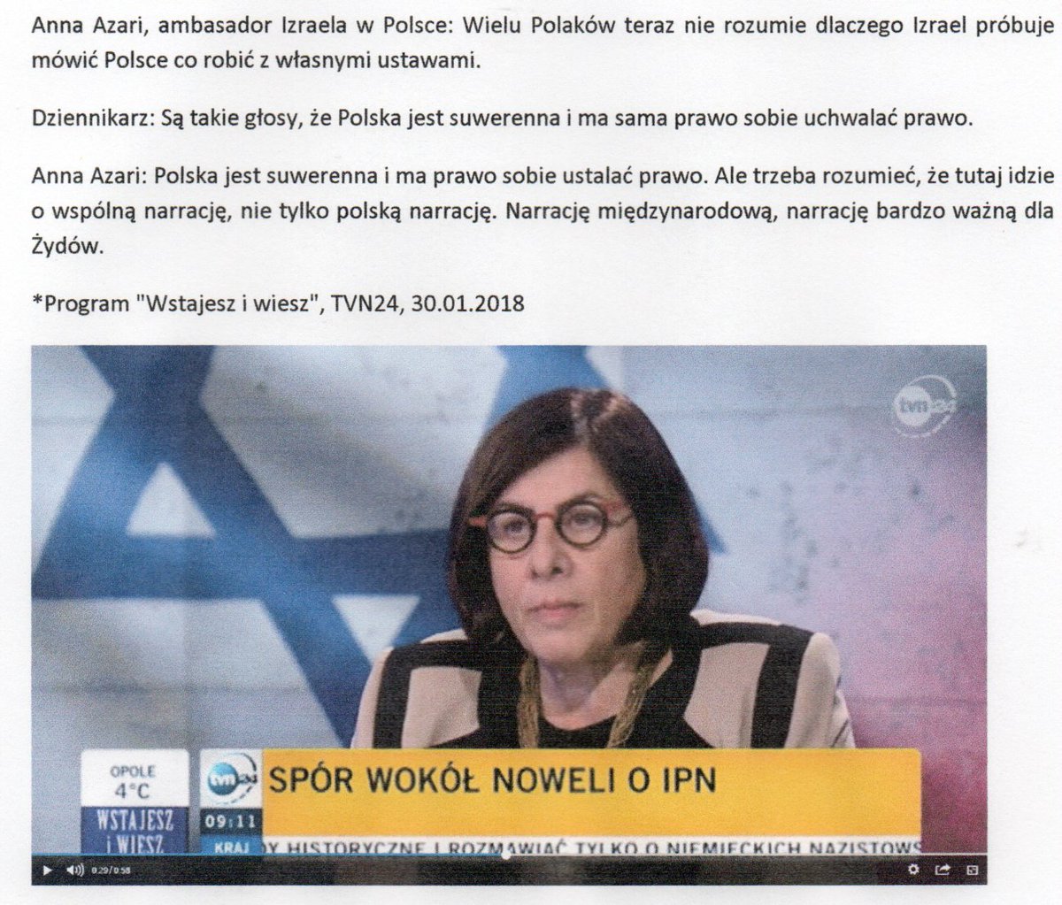 O wystąpieniu Anny Azari, reakcji polskiego rządu na jej słowa i relacjach polsko - izraelskich, a także o wyprawie Tomasz Mackiewicza i o próbach zakłamywania historii.
