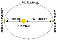 Rysunek pokazuje kształt orbity Ziemi w przesadzie. W rzeczywistych proporcjach eliptyczność orbity Ziemi jest niewielka.Długość dłuższej osi różni się od krótszej osi elipsy mniej niż 1%. Orbita Ziemi jest niemal okręgiem. Na nasze szczęście :)