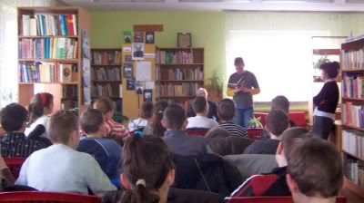 Na sali mlodziez szkola i w tyle paru doroslych. Pani Myszynska opowiadala o sobie, czytala i dala uczniom do czytania wiersze i teksty gwara. A takoz wywiazala sie zywiolowa dyskusja.