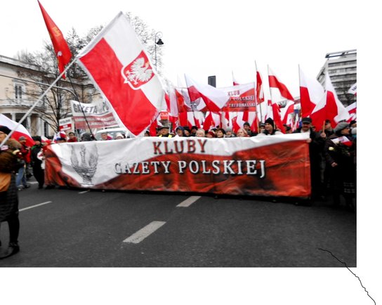 Powiedzial, ze w marszu szli przebierancy. Mieli flagi prosto z fabryki, wszystkie nowe i jednakowe. Nie przyniesione z soba z domow.