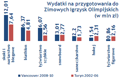 Dużo więcej kosztowały przygotowania do olimpiady. W latach 2008-10 w ramach Programu olimpijskiego Vancouver 2010 Ministerstwo Sportu wydało nieco ponad 31 milionów złotych.