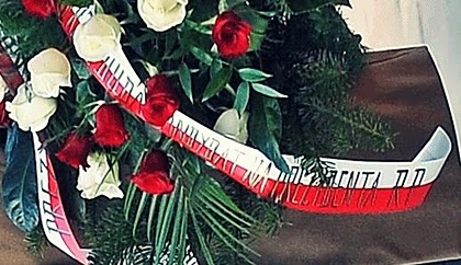 Treść tekstu na szarfie, która okraszała wieniec z biało-czerwonych róż.