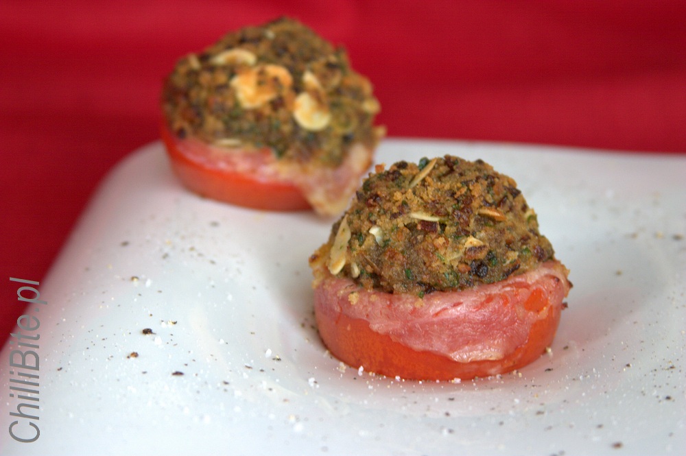 Na oliwie z łyżką masła podsmaż na jasne złoto drobno posiekany czosnek i cebulę pokrojoną w kosteczkę. Uwaga - nie powinny się zrumienić, gdyż podczas późniejszego zapiekania zgorzknieją. Dosyp dużo bułki tartej i zestaw z ognia. Dodaj posiekaną drobno natkę pietruszki, płatki migdałowe i sporo masła tak, by powstała klarowna pasta. Dopraw solą i pieprzem - nie zapomnij - mi niestety czasem się zdarza :) Pomidory przekrój w poprzek na połówki, wyjmij ostrożnie łyżeczką pestki. Plastry pancetty lub bekonu przekrój na pół i wyłóż nimi wydrążone połówki pomidora tak, by lekko wystawały na zewnątrz. Nakładaj masę do środka i uformuj zgrabny kopczyk na górze. Zapiekaj w piekarniku nagrzanym do 180°C przez ok. 12-15 minut.