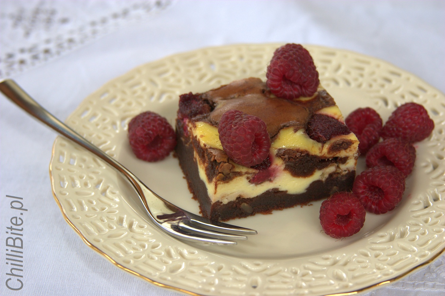stronie, a jeszcze później pojawił się na na polskim forum kulinarnym. Od pierwszego spróbowania, miłość do tego cudnego mariażu czekolady, sera i malin trwa. Koniecznie spróbuj też sernikowego brownie z wiśniami lub połówkami mirabelek! mmmmm
