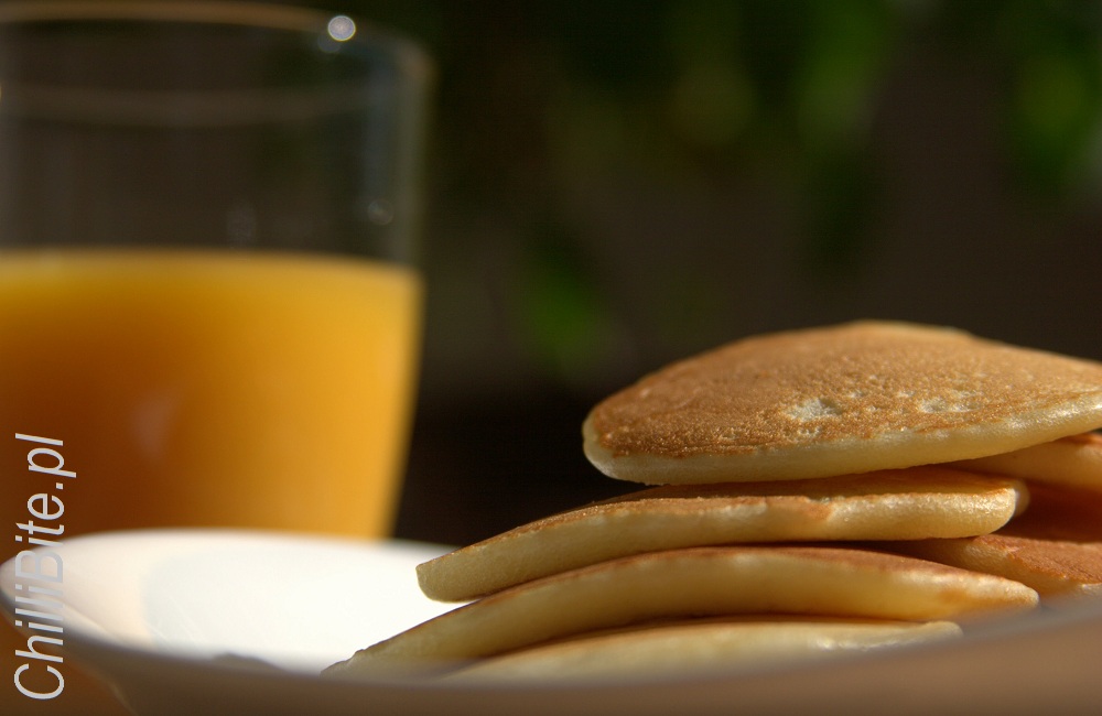 Kilka lat temu natknęłam się na przepis, który po wypróbowaniu okazał się najbardziej zbliżony do znanego nam "oryginału". Powiadam Wam - na takie śniadania warto czekać cały tydzień!  Lekkie, puszyste,  rozpływające się w ustach. Doskonale smakują ze szklanką świeżego soku pomarańczowego lub zimnego mleka. Najlepsze są oczywiście z syropem klonowym, ale lubimy też do nich miód gryczany lub wrzosowy i wszystkie dżemy, konfitury i powidła, które akurat mam w spiżarni. Z patelni nie schodzą idealnie równe, w owalnych kształtach. Powstają z nich bałwanki, motylki, ludziki - co tylko fantazja kuchcikom podpowie. Wszystkie jednak smakują tak samo fantastyczne. Dla nas amerykańskie pancakes to taka rodzinna śniadaniowa tradycja :)