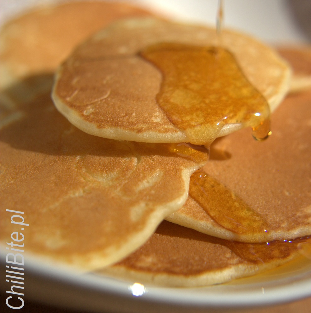 Wymieszaj mokre składniki i dodaj przesianą mąkę. Wylewaj łyżką do zupy niewielkie placuszki i smaż na suchej patelni naleśnikowej na małym ogniu do lekkiego zezłocenia. Zanim przewrócisz placuszka na drugą stronę, powinny popękać wszystkie bąbelki, które powstają w trakcie smażenia, a jednocześnie placuszek odpowiednio podeschnie - trwa to ok 2 minut. Potem jeszcze dosłownie 2 minuty na drugiej stronie i gotowe :) Podawaj polane syropem klonowym lub płynnym miodem. Albo.... jedz z czym chcesz :)   Smacznego ...
