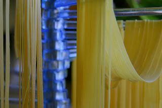 Zrobienie pierwszego makaronu wspominam jako wielkie przeżycie - w sumie 3 składniki - mąka, jaja i sól i "toto" niby ma być pyszne? Eeee coś mało skomplikowane, pewnie będzie jakiś haczyk i na pewno się nie uda. A jednak okazało się - najpierw proste, potem zabawne, a jeszcze później relaksujące i odprężające. Uwielbiam robić tagliatelle! I wciągam w tę moją pasję, albo chociaż zapraszam do zabawy wszystkie kobiety, które lubią chociaż czasami mieć nos i łokcie ubrudzone mąką. Bardzo gorąco Was namawiam - umówcie się we dwie, trzy, kupcie najlepszą mąkę, jaja od kur z wolnego wybiegu i sól morską. Nie zapomnijcie o papierowych torebkach (takich dużych, jak od pieczywa), by móc w nich układać wysuszone nitki, o dobrym winie, żeby było weselej i świetnej, radosnej muzyce, która zapewni jeszcze lepszy nastrój.
