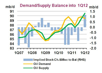 Na powyższej ilustracji mamy bardzo ciekawe zestawienie. Po lewej stronie podziałka milionów baryłek ropy/dziennie dla zobrazowania linii żółtej ( oil demand - popyt na ropę) i zielonej ( oil supply - podaż). Po prawej podziałka w tych samych jednostkach ale dla RÓŻNICY pomiędzy podażą, a popytem, której obrazują niebieskie prostokąciki. Jak można zauważyć po raz pierwszy od ROZPOCZĘCIA KRYZYSU występuje NADPRODUKCJA ROPY!!! Co z tego wynika? Dwie, trzy obserwacje: