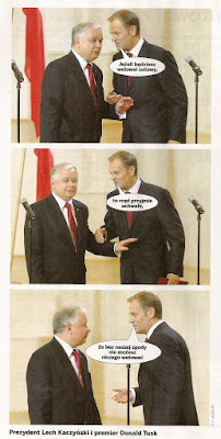 odbyliśmy z Gniewkiem dyskusję na temat m.in. tego, czy niszczenie wizerunku prezydenta jest przebiegłym planem PR-owców z PO, czy zbiorem indywidualnych postaw dziennikarzy mainstreamowych mediów. I proszę, po kuriozalnej uchwale rządu "określającej" kompetencje prezydenta*, dzisiaj mamy następujący zestaw: R. Sikorski rano werbalnie "pada na kolana" przed L. Kaczyńskim, wypowiadając się w znanym już dobrze od czasu "dożynania watah" stylu. Zwrócił się publicznie do prezydenta, by "odpuścił" i nie jechał na szczyt. Dzień wcześniej mieliśmy wypowiedzi B. Klicha o tym, że prezydent "nie może polecieć do Brukseli", bo rozchorował się prawdopodobnie jeden z dwóch służących w polskim lotnictwie wojskowym pilotów. Bo przecież więcej ich nie ma - to jasne.