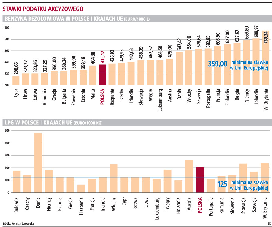 Podaje jednocześnie, że zgodnie z przepisami dyrektywy energetycznej minimalna stawka akcyzy wynosi: 421 euro na 1000 l w przypadku benzyny ołowiowej (w Polsce akcyza wynosi 1747 zł/1000 l); 359 euro na 1000 l w przypadku benzyny bezołowiowej (w Polsce akcyza wynosi 1565 zł/1000 l); 302 euro na 1000 l w przypadku oleju napędowego (w Polsce akcyza wynosi 1180 zł/1000 l, 1099 zł/ 1000 l albo 1048 zł/1000 l w zależności od zawartości siarki); 125 euro na 1000 l w przypadku LPG (w Polsce akcyza wynosi 695 zł/1000 kg).