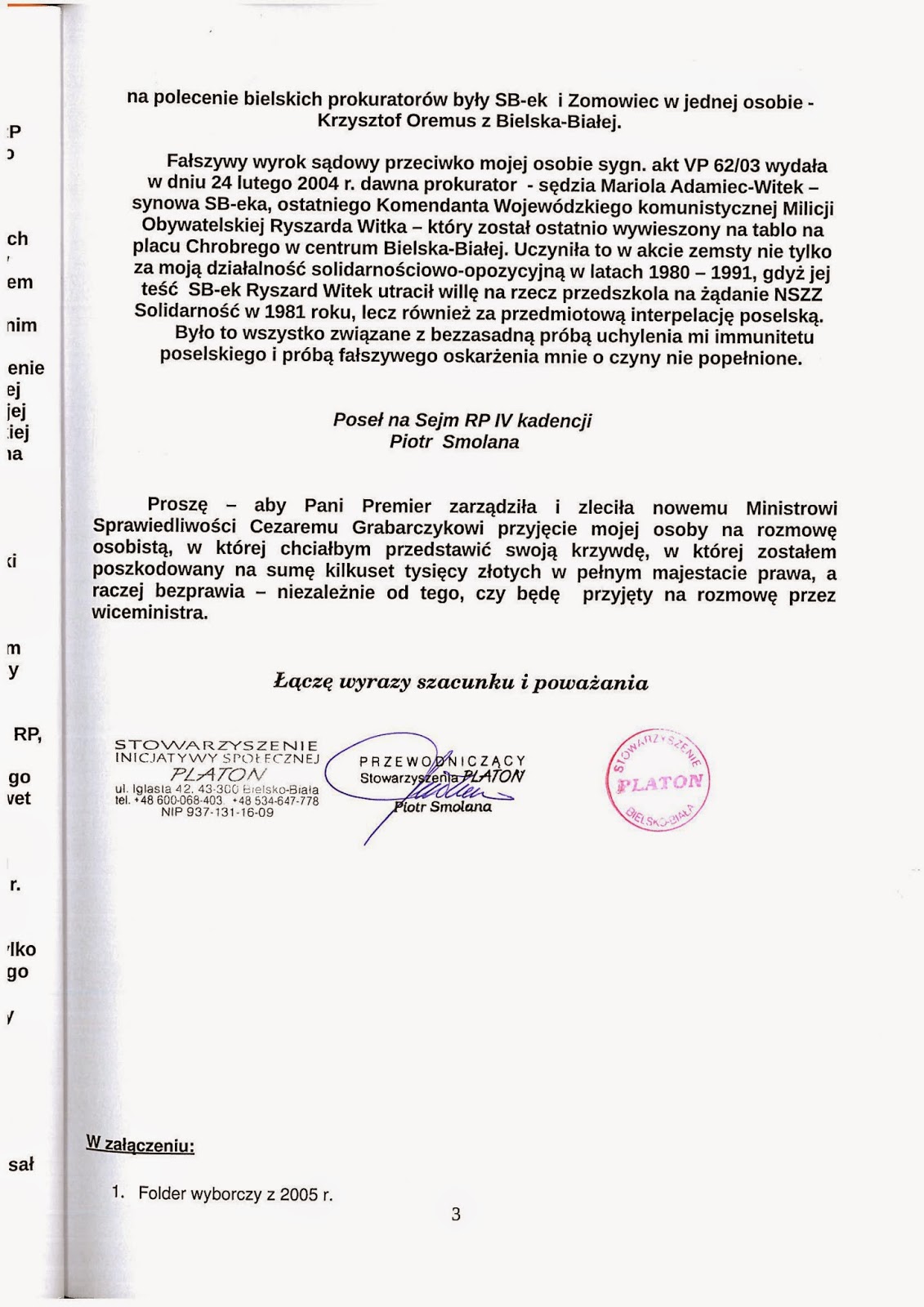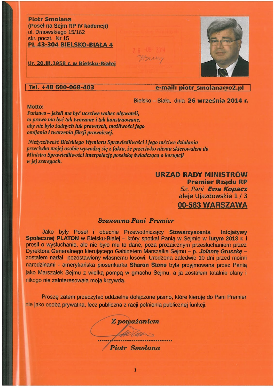 Były Poseł na Sejm RP IV kadencji Pan Piotr Smolana prosił mnie abym opublikował jego List Otwarty do Pani premier Ewy Kopacz - czym niniejszym czynię.