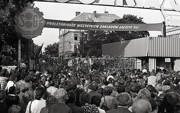 I wisiały te postulaty pod słowem Lenin. Słowa o wolności obok słowa Lenin. I te słowa o wolności z tej bramy pokazywano na cały wolny swiat bo w krajach komunistycznych nie pokazywano. Zbyt symboliczne by to było - tu Lenin a robotnicy o wolności .