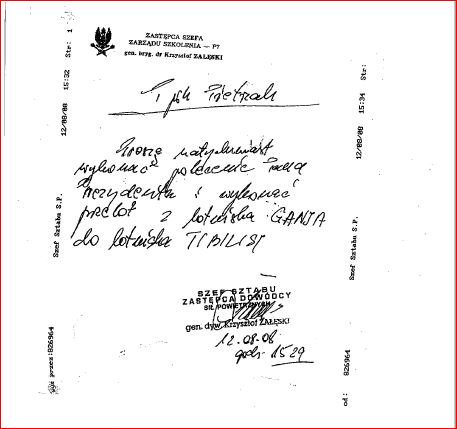 "Informuję, że w dniu 11.08.2008 dowódca 36 SPLT płk Tomasz Pietrzak postawił mi zadanie dotyczące wylotu do Tallina (Estonia) oraz wylotu Prezydenta RP w dn. 12.08.2008r do Ganji (Azerbejdżan) przez Simferopol (Ukraina). Osobiście postawiłem zadania przydzielonej na ten wylot pozostałej załodze tj.: kpt. Arkadiuszowi PROTASIUKOWI - II pilot, mjr Robertowi GRZYWNIE- nawigator, chor. Arturowi KOWALSKIEMU- technik pokładowy.
