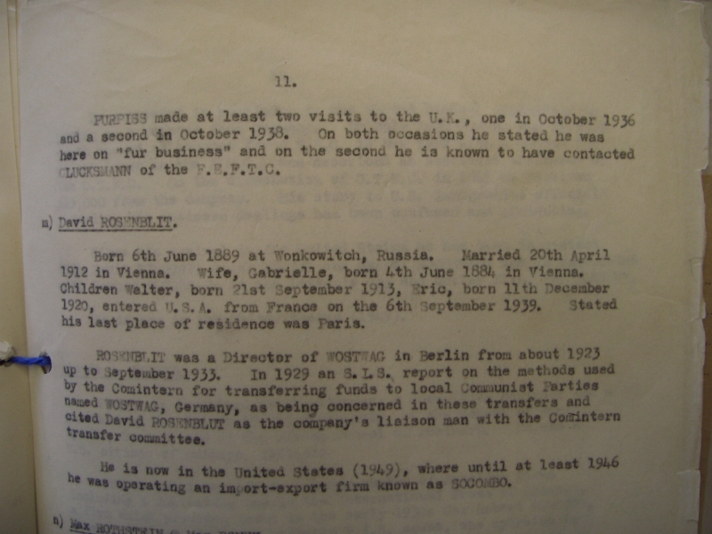 "[...] C. Możliwym jest, że wspomniana właśnie jednorodność nazewnictwa [WOSTWAGIMEX, SOCOMBO, SOCIMEX, PRODIMEX, SIMEX - przyp.mój] nie wynika głównie ze związku tych firm z sowieckimi służbami specjalnymi ale z faktu, że były one, bez wyjątku, założone przez Żydów, wielu z nich [to] aktywni syjoniści. Rosenblitt, Zloczomer, Rothstein, Glucksman [Gluckerman] i Czuczka, wszyscy oni znali się z czasów studenckich w Wiedniu, gdzie co najmniej dwóch ostatnich było członkami "Poale Zion". Glucksmann, prawdopodobnie Wright i z pewnością Trepper, wszyscy trzej odwiedzali Palestynę, w tym czy w innym czasie, podczas gdy Grohsvogel w 1934 dotarł do fałszerza w Brukseli dla [uzyskania] dwóch syryjskich wiz do polskich paszportów. Czuczka był związany przez całą karierę z organizacjami uchodźczymi w Europie i Amerykach, gdy zapytano go o powiązania z Glucksmannem (z “Poale Zion” i “The Far East Fur Trading Co."), ze Zloczomerem ("speculant agent" Krivitzkiego) odpowiedział, że była to bardziej lub mniej powszechna wiedza wśród "żydowskich uchodźców w Paryżu". Wszystkie te osoby (z wyjątkiem Glucksmanna, który nie żyje i Treppera, którego miejsce pobytu jest nieznane) są teraz w Stanach Zjednoczonych, Wright jest wciąż zatrudniony w biznesie futrzarskim robiącym interesy z rządem sowieckim, firma Roseblitta, poza firmą od "podrobów", interesowała się eksportem maszyn włókienniczych do Palestyny. [...]"