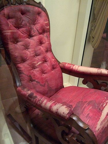 1. Ślady krwi na fotelu, na którym siedział Prezydent Lincoln - został zastrzelony ; ślady krwi są do dziś widoczne na purpurowym obiciu fotela.