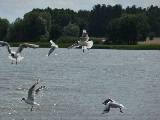 Stadko mew śmieszek podrywa się z powierzchni jeziora tuż przed wejściem do kanału.