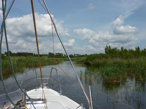 Przed nami wąski szlak porośnięty bujnie trzciną, sitowiem i wszelką roślinnością na i podwodną. Trzeba będzie uważać na silnik.