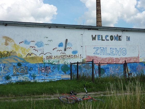 "Welcome in Zalewo" - powitalne graffiti przy pomoście do cumowania.