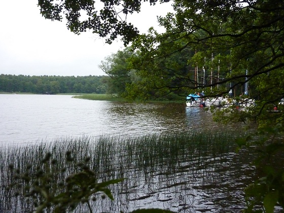 Wypływaliśmy z Siemian w pośpiechu, chcąc zdążyć przed deszczem na położony naprzeciw Lipowy Ostrów. Jak się człowiek spieszy, to się diabeł cieszy, pół drogi przebyliśmy więc oczywiście w najsilniejszej ulewie. Przycumowaliśmy w zacisznej zatoczce po wschodniej stronie wyspy, gdy deszcz już prawie przestał padać.