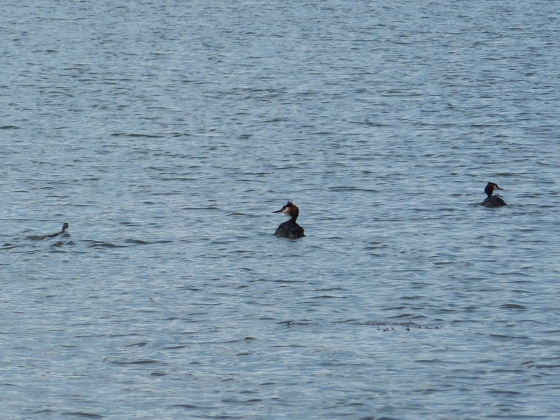 Naprzeciw, w Zatoce Miłej, zwraca naszą uwagę urocza rodzinka perkozów.