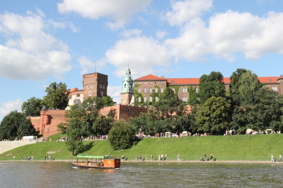 Wsiadamy na statek. Po prawej stronie zostaje Wawel, wzgórze katedralne, królewskie i smocze, o którym można dużo i jeszcze więcej.
