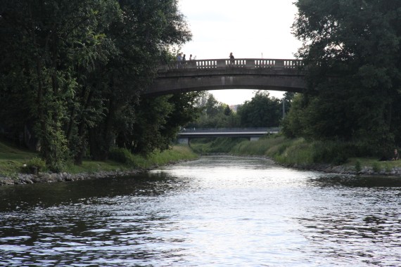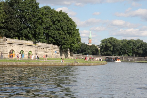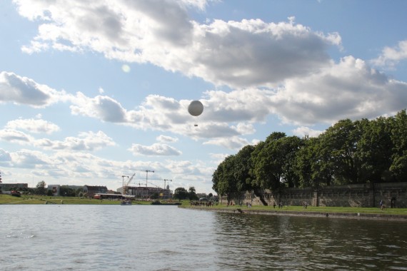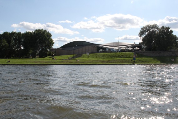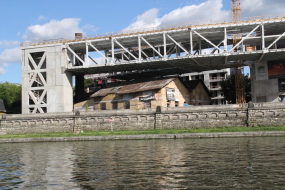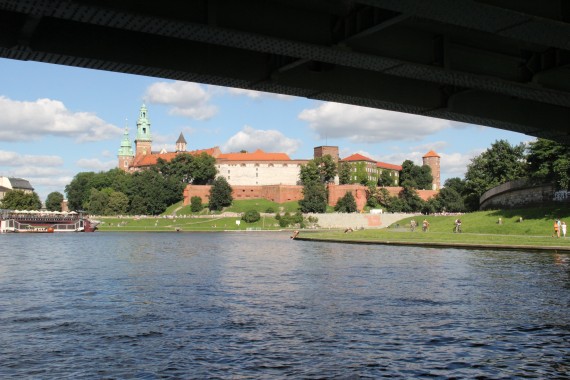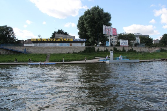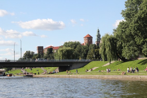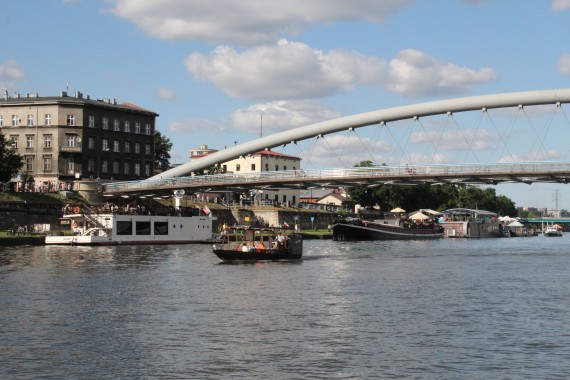 Znów przepływamy pod mostem Dębnickim, mając przed sobą serce Krakowa (a wiele osób zgodzi się pewnie, że i Polski) jak na dłoni. Teraz statki mieszczą się tu bez trudu, ale trzy lata temu, podczas majowej powodzi, nie przepłynęłaby tędy nawet łódeczka z kory. Poziom wody był tak wysoki, że niewiele brakowało, aby zaczęła przelewać się górą, trzeba było dociążyć most ciężarówkami z piaskiem, by wezbrana rzeka nie naruszyła jego konstrukcji. Teraz w letnie, słoneczne popołudnie trudno to sobie nawet wyobrazić.