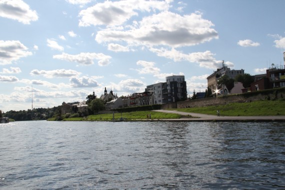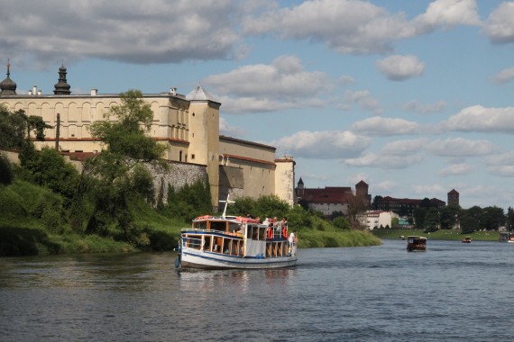 Kraków przywitał nas ponad trzydziestostopniowym upałem, który odebrał nam z miejsca wszystkie siły. Nawet pies, zawsze pełen energii do zabawy, podczas spaceru szybko się męczył i wolał wracać do domu, gdzie w przydomowym ogrodzie znajdował ochłodę w cieniu drzew i chłodnej wodzie w oczku. Z tym większym żalem myśleliśmy więc o skończonym dopiero co urlopie. I tym chętniej, mimo wciąż panującego w domu popodróżnego rozgardiaszu, skorzystaliśmy z rodzinnej propozycji spędzenia niedzielnego popołudnia nad Wisłą, a konkretnie na krótkim rejsie statkiem po rzece. Jakby nam kołysania i zapachu wody było mało... Choć to oczywiście nie to samo, żadnych sznurków do pociągania, steru też nie można dotknąć, no i gdzie te przechyły... Wszystkie te braki rekompensowały w nadmiarze widoki, znane, bliskie i niepowtarzalne, jakich ani na Mazurach, ani nigdzie na świecie nie da się ujrzeć. Ruszaliśmy w podróż po rzece, historii, legendach i wspomnieniach.