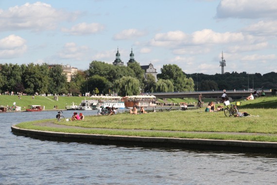 Na bulwarach wiślanych trwa letnia sielanka. W tle widać wieżę telewizyjną na Krzemionkach.