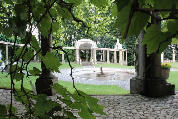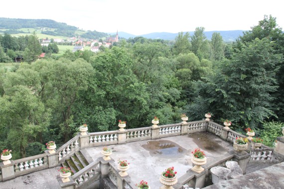 To taras na tyłach pałacu. Rozciąga się z niego piękny widok w kierunku Sękowej. Proszę jednak zauważyć, że ów taras znajduje się na wysokości koron drzew rosnących tuż obok niego. Umiejscowiony bowiem został na krawędzi wysokiego, pionowego urwiska, u stóp którego płynie rzeka Sękówka.