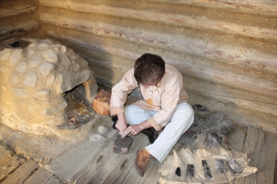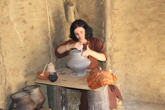 W następnej chacie kobieta w lnianej brązowej sukni pracuje w skupieniu nad glinianym garnkiem, wyglądającym niemal identycznie jak naczynia widziane wcześniej na muzealnej wystawie.