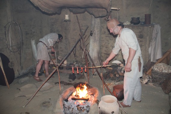 Gdzie indziej w zadymionym wnętrzu zastajemy mieszkańców zajętych pieczeniem jakichś kawałków mięsa nad paleniskiem umiejscowionym na samym środku izby