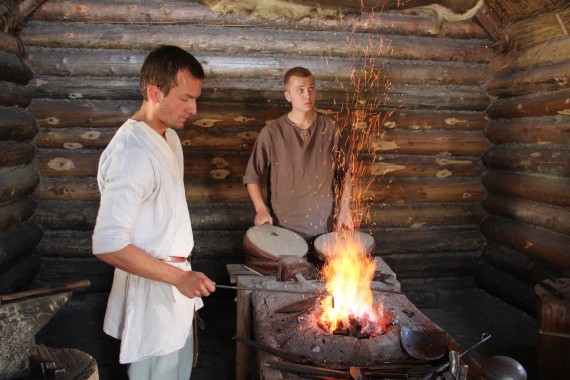 albo trafiamy do kuźni i widzimy wykuwanie żelaznego grota do oszczepu.