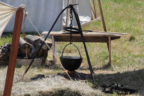 Obok namiotu czeka, przygotowany do planowanego turnieju, rycerski rynsztunek, a w podwieszonym nad ogniskiem kotle coś się warzy.