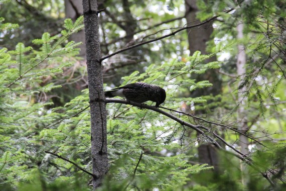 Po kilku krokach kolejna niespodzianka. Idący z przodu syn aż się cofnął, żeby uciszyć rozgadane dziewczynki: "Zobaczcie, dzięcioł!". Rzeczywiście, przy samej ścieżce na drzewie siedział dość duży ptak i zapamiętale stukał dziobem w gałąź. Jednak gdy podeszłam bliżej i lepiej mu się przyjrzałam, stwierdziłam, że bardziej przypomina mi wronę, niż dzięcioła, niemniej takiej nakrapianej wrony nigdy wcześniej nie widziałam. Ptak nie był zbyt płochliwy, dał mi się sfotografować, po czym odleciał, a my z synem całą drogę potem zastanawialiśmy się, co to było. Teraz już wiem, że moje domysły były bliższe prawdy, natknęliśmy się bowiem na kuzynkę wrony - orzechówkę.