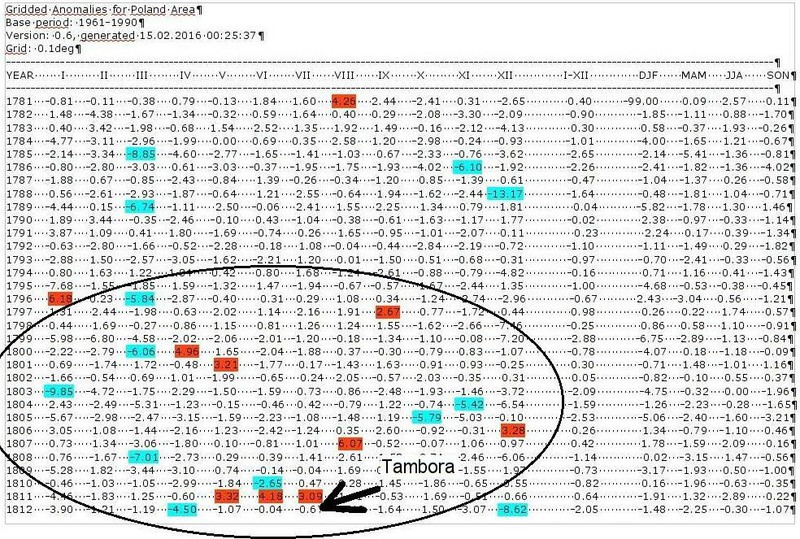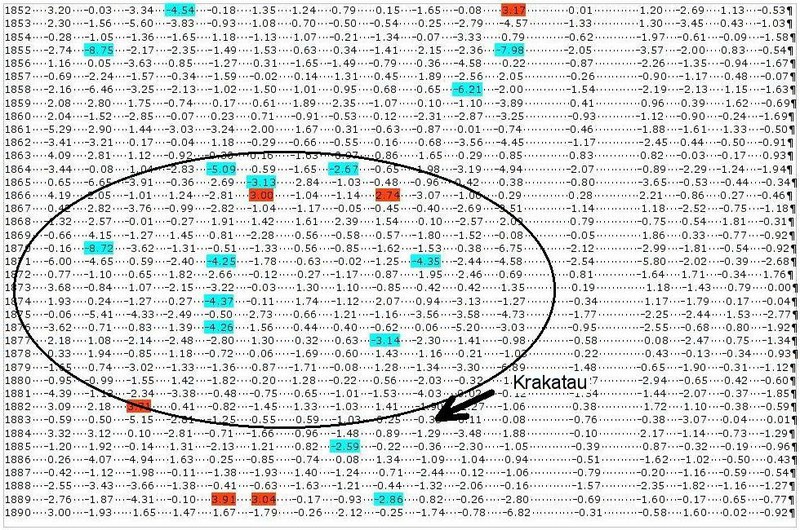 Szczególnie wyraźnie widoczne jest to w przypadku największego z tych wybuchów czyli erupcji wulkanu Tambora.