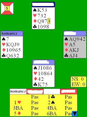 Dalej nie widać, hihi jak można to wygrać?===============================Mój sposób na to rozdanie:1/ Podziękowałem P za wspaniały, hmm, stół.2/ Chwila zastonawienia, najwyżej 3 sek. Lewy: 3-4 karowe, 4 kierowe, 2 pikowe 2, 2-3 treflowe.Impas karo i pik muszą stać!!Więc gramy J karo ze stołu i dalej A i K. E zrzuca kiera. To gramy kiery.Co wyrzucacie ze stołu? Dwa piki. E dokłada 3 razy i następie zrzuca pika. I końcówka, tylko gra się tylko szybciutko, bez zastanowienia.N: s AD9 h - d - c AJ4 E: s JTx h - d - c KxxS: s 7 h- d T c Q632I gramy małe trefle na impas , a ze stolu walecik. Gdybście siedzieli na miejscu E, to co bijecie krolem oczywiście? W co wychodzicie? Kłopot nie ma w co wyjść. Bo zagranie w pika rozwiazuje kolor, a w trefla , daje rozgrywajacemu dojscie do reki i 3 lewy treflowe .A po jaką cholerę wzieliście pierwszą lewę treflową ))?!?! Gnata wam ktoś do głowy przystawił? Bo figur na figur? Po co trzymaliście do końca przy królu te dwie blotki treflowe??I tak oto idiotyczny, głupi i beznadzijeny szlemik został w 65 sekund wygrany ))).A wystarczyło dać wałkowi treflowemu wziąć lewe i koniec tylko 11 lew dla rozgrywającego, bo 3 treflowych już nie weźmie!!!pozdr.ps. Gdyby E w trakcie rozgrywki pozbył się wcześniej blotki trefl, to szlemik z góry skazany jest na wygranie )). Dlaczego nie należy tego robic? Otóż cza patrzeć co rozgrywający zrzuca ze stołu na kiery (jeśli ma singlowego króla pik, to wywali do ostatniego kiera trefla ze stołu!!!) Gdyby miał w ręce dwa piki to chyba próbowałby grać przez piki )).