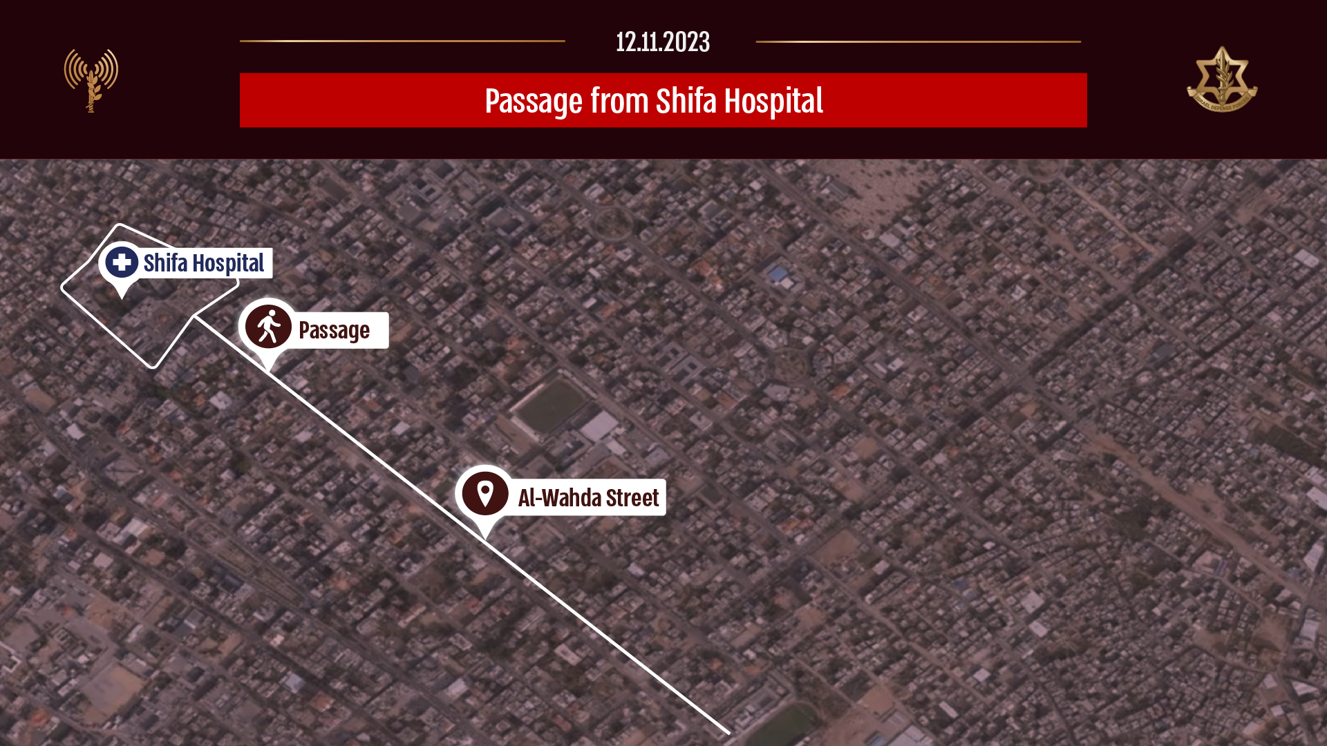W ostatnich dniach wysoki rangą oficer izraelskiej Administracji Koordynacji i Łączności ze Strefą Gazy wielokrotnie rozmawiał z kierownikiem szpitala Shifa i przedstawiał mu możliwe przejścia ze szpitala. Żołnierze IDF otworzyli i zabezpieczyli przejście, które umożliwia ewakuację ludności cywilnej pieszo i karetkami pogotowia.