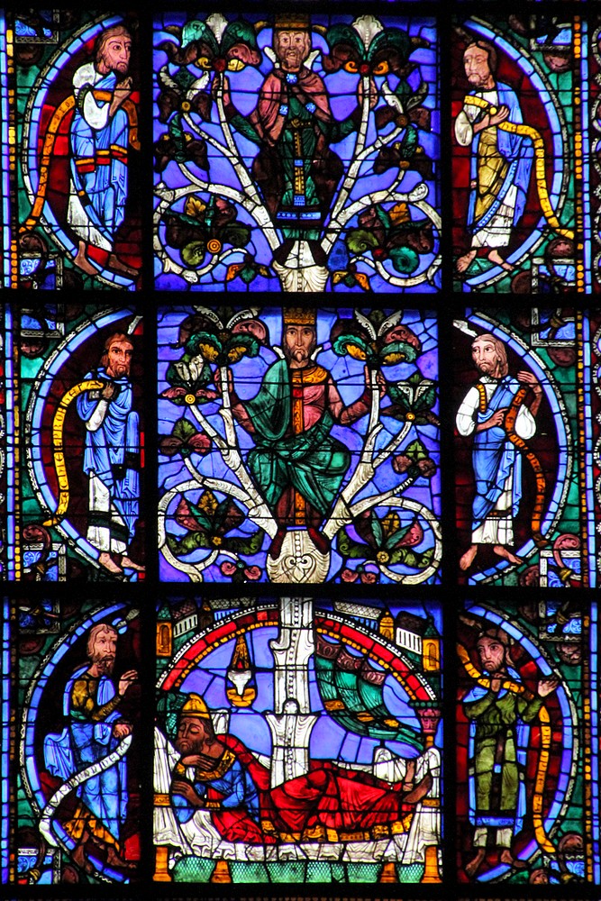 Aby móc wyrazić szczegóły w czerwonym tle otaczającym proroków, artysta dodał do szerokiego czerwonego płaszcza Jesse (C) łóżko okryte białą draperią, która służy jako punkt wyjścia do zmiany koloru na odcień drzewa. Granatowy strój, który obejmuje górną część ciała Jessego oraz białe i żółte frędzle dają niepowtarzalny blask czerwonemu płaszczowi. Czerwone pola, na których umieszczeni są prorocy zgrano z niebieskim paskiem w tonie ogólnym oraz z białymi szczegółami, a następnie z tłem (G) pięknym zielono – szmaragdowym akcentem, gorącym