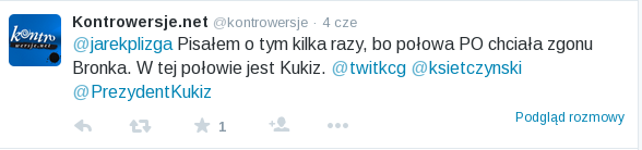 Na Tłiterze był łaskaw sformułować opinię: "Pisałem o tym kilka razy, bo połowa PO chciała zgonu Bronka. W tej połowie jest Kukiz." No jeżeli połowa Platformy chciała zgonu Bronka to znaczy że chciała zwycięstwa Dudy, czyli Duda wychodzi na kandydata platformianego. I tu zostałem zdemaskowany!