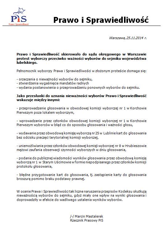 PiS złożyło protest wyborczy do sądu okręgowego w Warszawie z żądaniem unieważnienia wyborów do sejmiku województwa lubelskiego. Przedstawione dowody fałszerstw są tak porażające, że uznanie wyborów za nieważne powinno być dla sądu zwykłą formalnością.