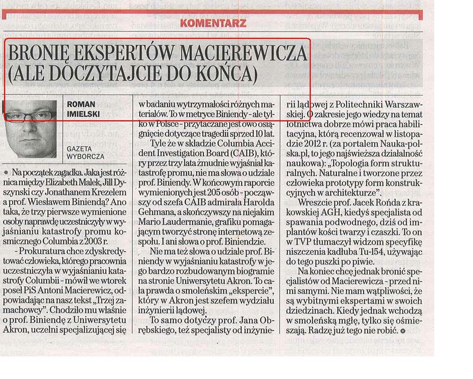 Oto brzmi on "Bronię ekspertów Macierewicza (Ale doczytajcie do końca)". Tytuł ten wymyślił niejaki Roman Imielski. I moim zdaniem tym tytułem powinien przejść do historii dziennikarstwa wręcz światowego.