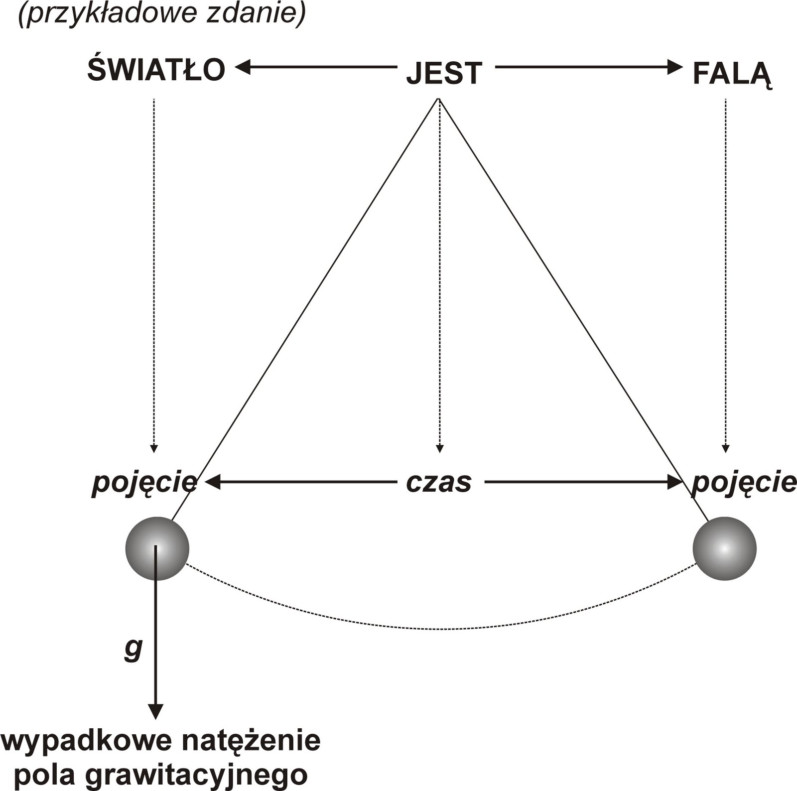 Model wahadła jest dobrym przybliżeniem sposobu naszego myślenia i dyskutowania. Większość zdań naszych zawiera nazwy pojęć i czas. Czas zaś ukryty jest w czasownikach. Niewiele znaczy powiedzieć „światło”. Ale: „światło jest” już zaczyna coś znaczyć, bo w wyrażeniu tym pojawia się czas w postaci czasownika „jest”. Zaczyna się w ten sposób dzianie (się). A co będzie jak powiem: „światło jest falą”? Dokonam, w ten sposób „wahnięcia” od jednego pojęcia (światło) do drugiego (fala) z łącznikiem, którym jest opis czasu (jest).