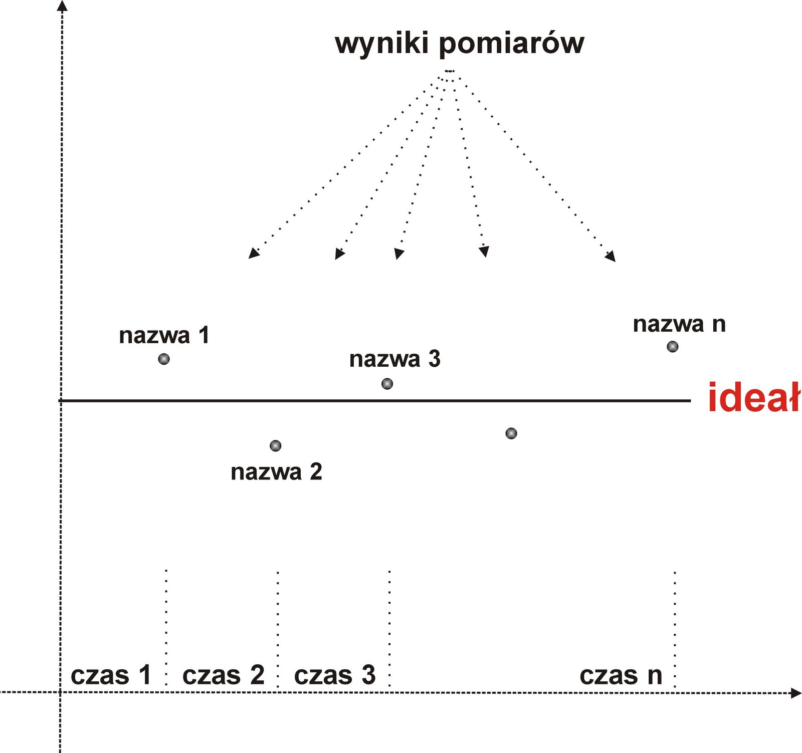 Rysunek poniższy przedstawia, wyniki pewnego hipotetycznego pomiaru fizycznego (np. okresów wahań), który można rozciągnąć na każdy pomiar. W zbliżaniu się do ideału „wypowiadamy” nieskończoną liczbę wielorakich pojęć, ale żadne z nich nie będzie zgodne z ideałem.