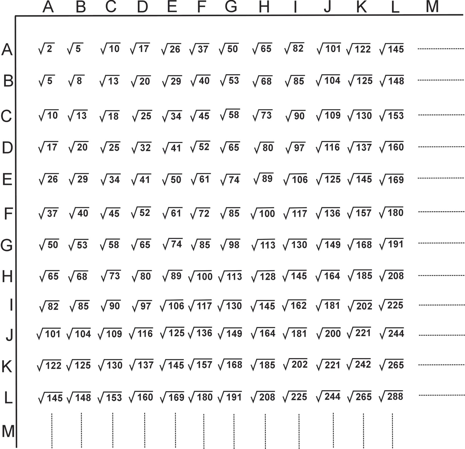 W ten sposób zdefiniowaliśmy odległość liter KL. Warto zauważyć, że jest to liczba niewymierna. Wykonując podobne obliczenia dla wszystkich połączeń liter, otrzymamy kwadratową macierz symetryczną. Fragment tej macierzy przedstawia rysunek poniżej: