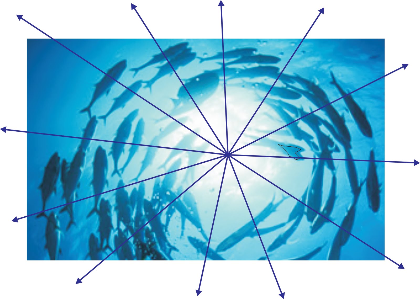 Grawitacja wytwarzana przez jedną rybę w ławicy jest niewielka, ale jeśli ryb w ławicy są tysiące, miliony – grawitacja całej grupy ma wymierną wartość. I jest to grawitacja dynamicznie zmieniająca się. Pojedynczy osobnik ławicy nie ma wpływu grawitacyjnego, ale cała grupa ma grawitację, która oddziałuje na świat zewnętrzny i stanowi jakby skupioną w jej przestrzennym środku siłę – stanowicą "świadomość" istnienia tej grupy.