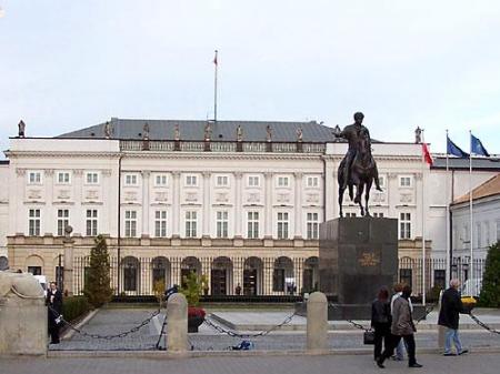 To dla oburzonych Mazurów - to jest Pałac Prezydencki, zwany Namiestnikowskim. Nie znalazłam zdjęcia, które obejmowałoby też oba lwy, ale jeśli ktoś ma - bedę wdzięczna. Pomnik z rączkami ma stanąć gdzieś tutaj - na linii osi Pałacu, najprawdopodobniej przed Poniatowskim Thornvaldsena, a za ogrodzeniem z lwami.