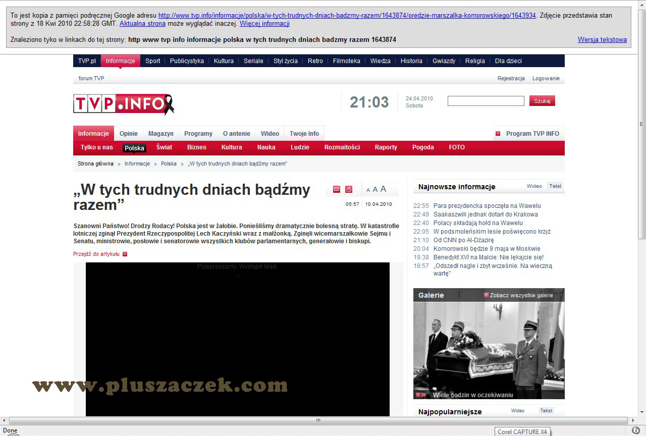 To jest kopia z pamięci podręcznej Google adresu : http://www.tvp.info/informacje/polska/w-tych-trudnych-dniach-badzmy-razem/1643874/oredzie-marszalka-komorowskiego/1643934.